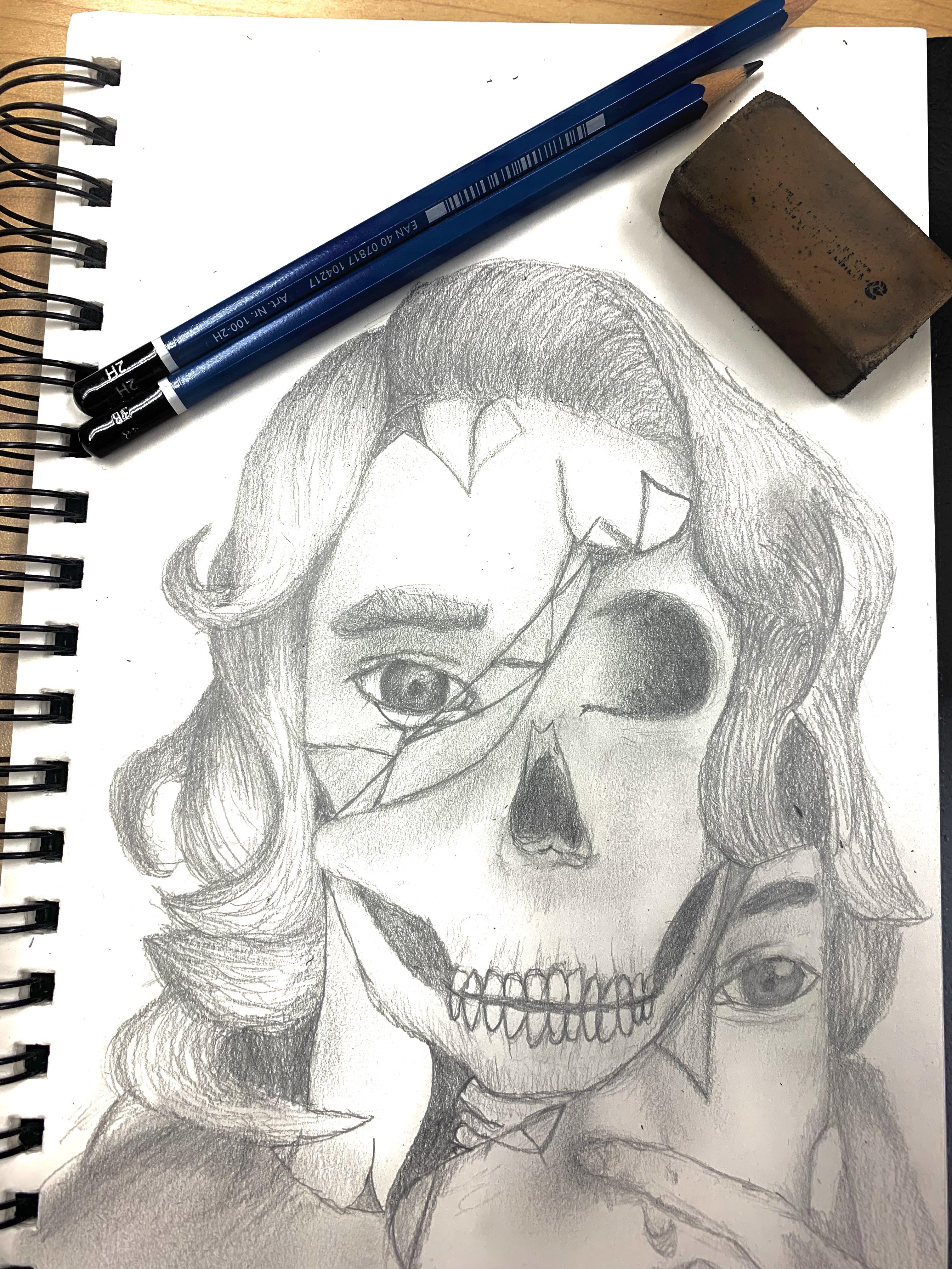 The mask broke / half face skull portrait. r/drawing