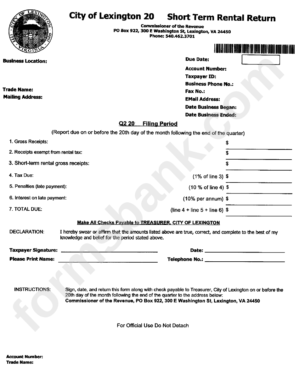 Short Term Rental Return Form City Of Lexington printable pdf download