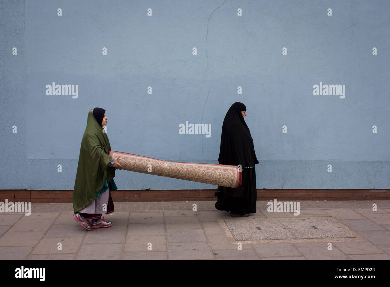 Muslim women carry heavy carpet along street on Walworth Road, Elephant & Castle, London borough