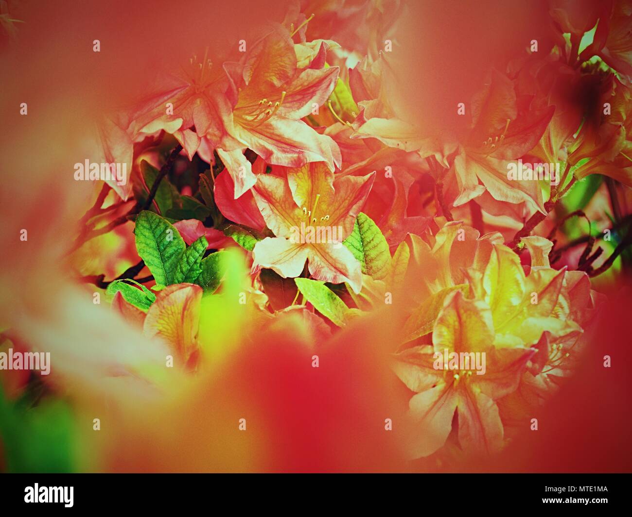 Detailed red azalea flowers in park. Popular houseplants, favorite