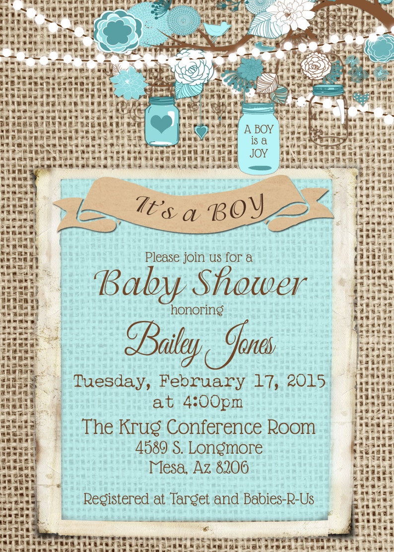Burlap Rustic Baby Boy Shower Invitation Mason Jar Shabby Etsy