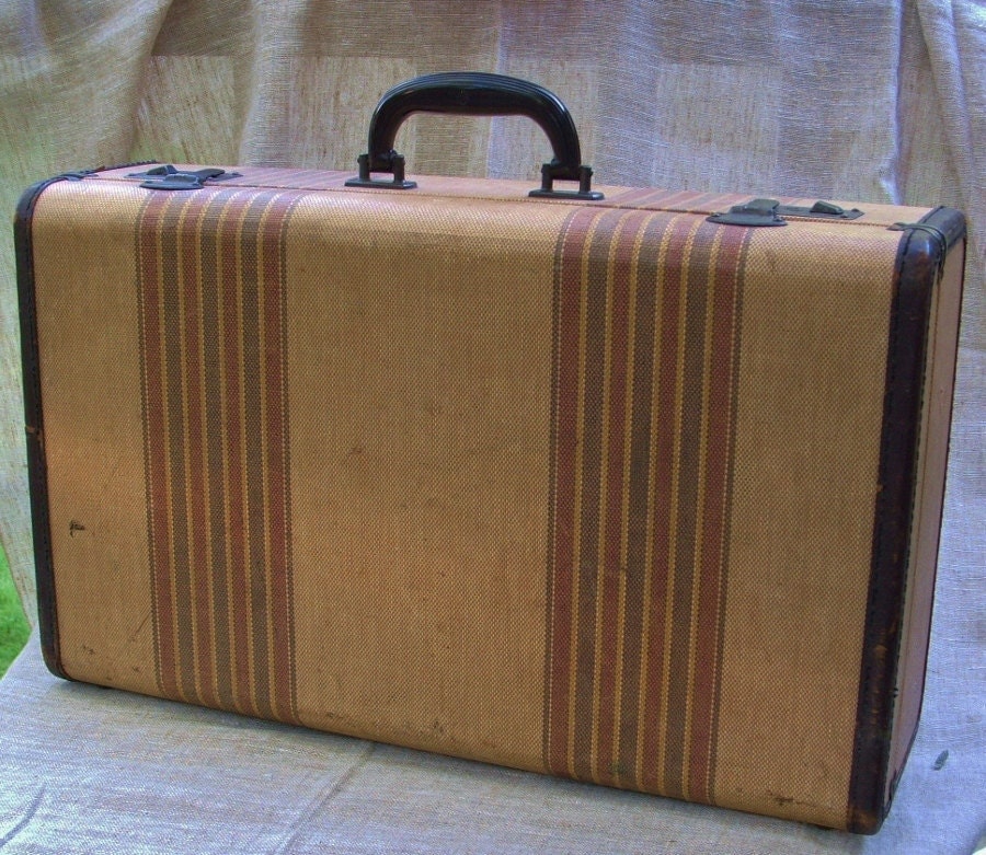 Vintage 1930s Luggage Suitcase Tan Rattan w. Stripes Medium