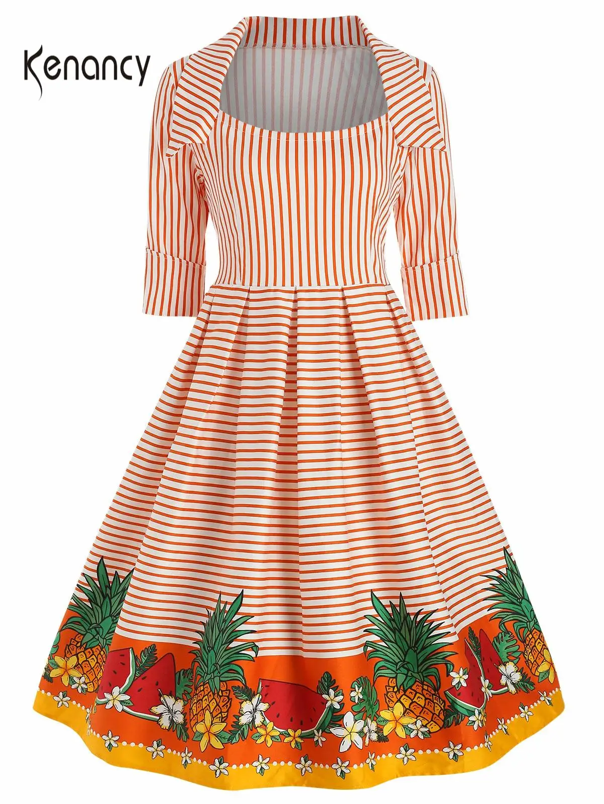Kenancy Striped Fruit Print Women Vintage Dress Half Sleeve Square