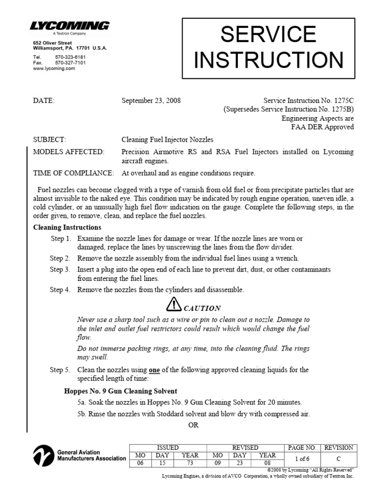How to fix fuel injector nozzles Please like and subscribe. YouTube Cleaning Lycoming Fuel Injector Nozzles Cleaning fuel injector nozzles models affected: So now i clean them every 200. This condition may be indicated by rough engine operation, uneven idle, a cold cylinder, or an unusually high fuel flow. The proper method of cleaning described in lycoming service instruction no.1275c includes washing the nozzle thoroughly with acetone. The nozzle should be cleaned with acetone or mek. Cleaning Lycoming Fuel Injector Nozzles.