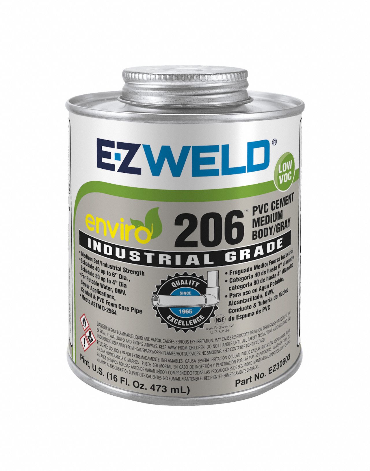 EZ WELD Gray PVC Cement, Medium Bodied, PVC, Size 16 oz, For Use With