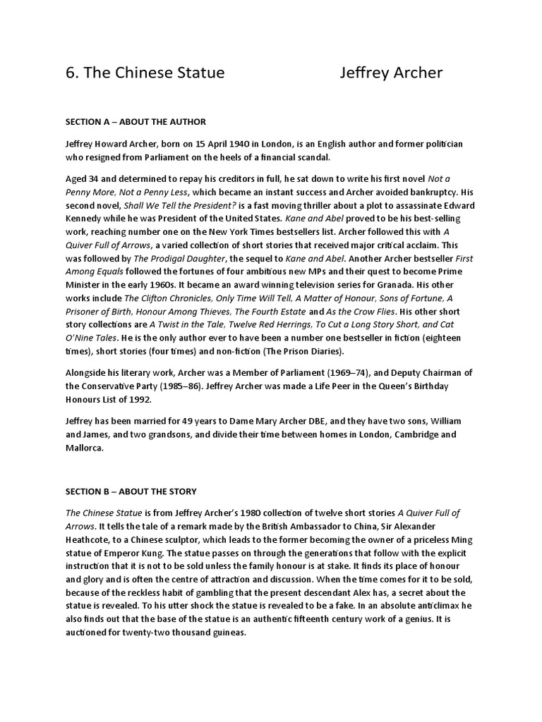 The Chinese Statue' by Jeffrey Archer (LSRTC) PDF Chinese Statue Critical Analysis Dear readers, the resource you are looking for has been shifted to our sister site litmarked.com. Need help on characters in jeffrey archer's the chinese statue? Need help with the chinese statue in jeffrey archer's the chinese statue? You can access it by clicking. ‘the chinese statue’ by jeffrey archer, published in his book ‘a quiver full of arrows’ in. Chinese Statue Critical Analysis.