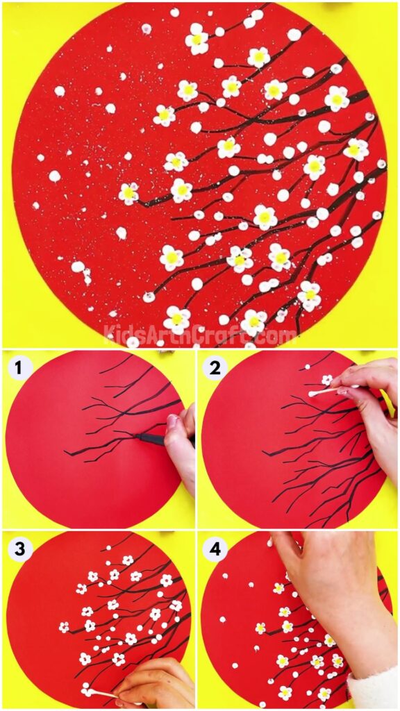 White Cherry Blossom Flowers Painting Using Cotton Buds Kids Art & Craft