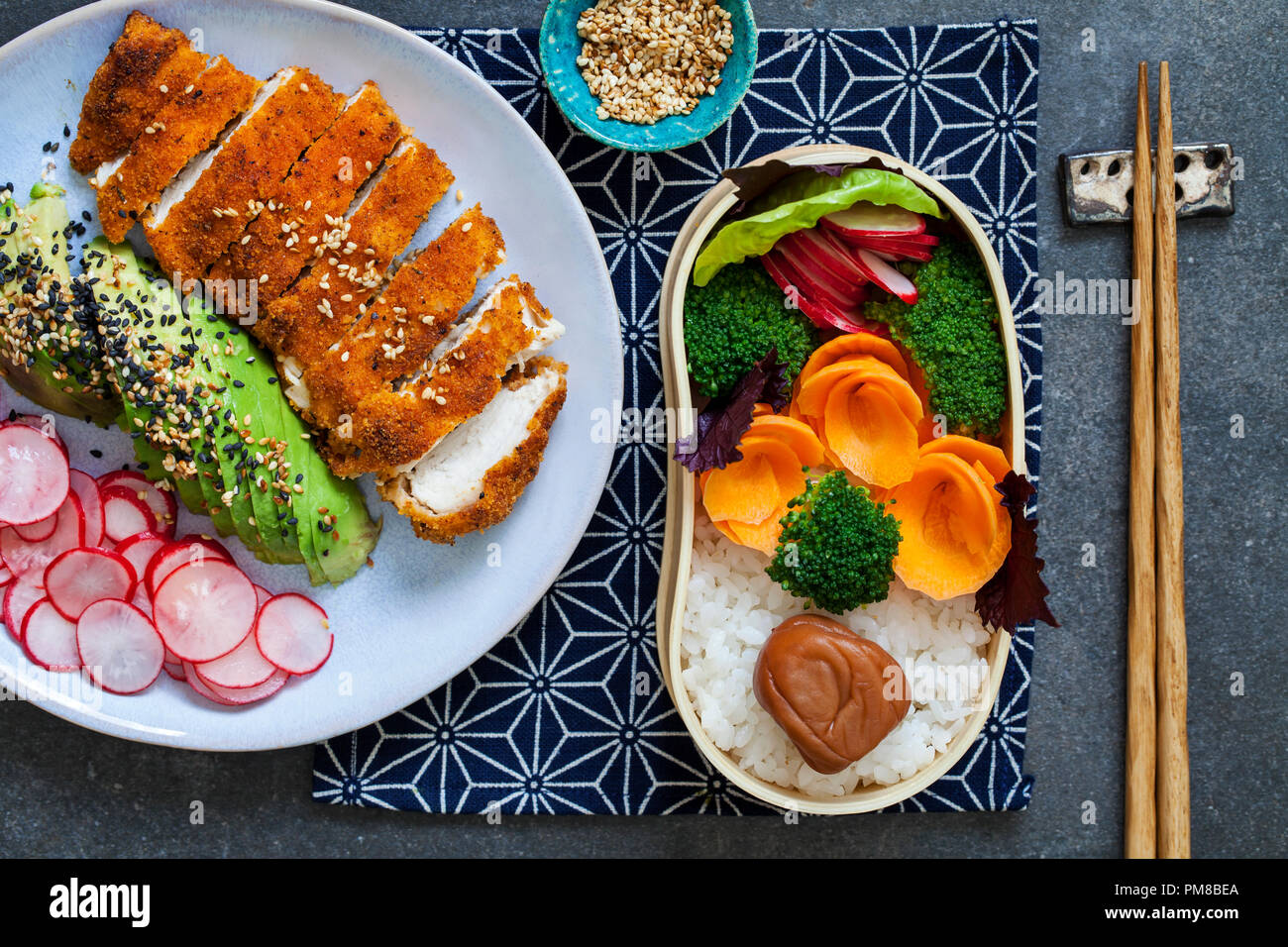 Japanese style lunch with crispy chicken and avocado Stock Photo Alamy