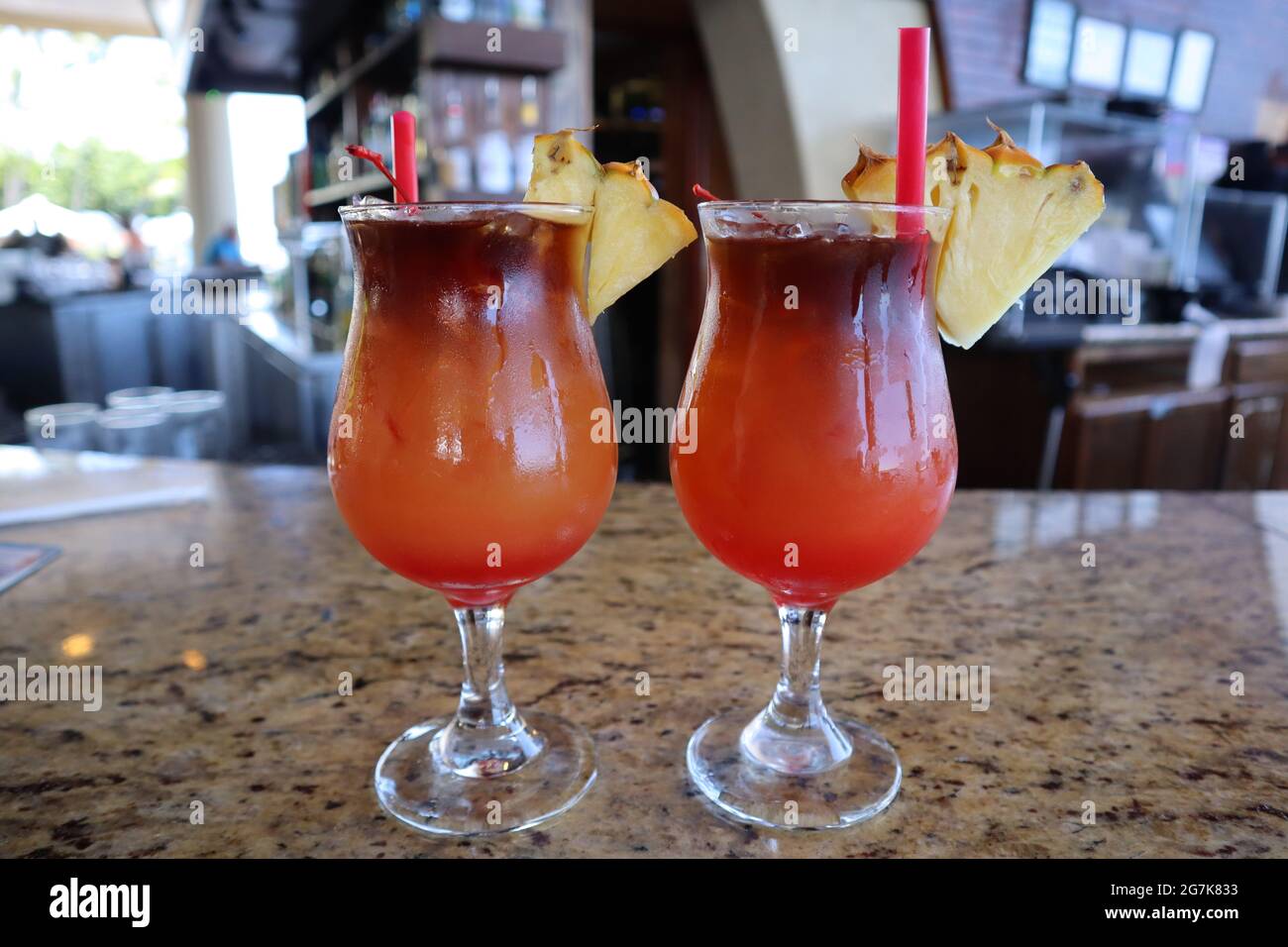 Pair of mai tai cocktail beverages with pineapple garnish at a bar in