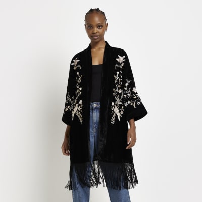 Black velvet embroidered kimono River Island