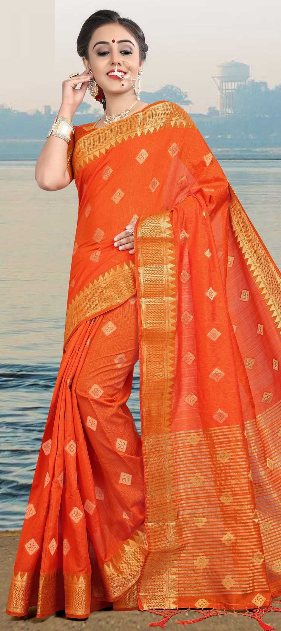 1536217 Party Wear Orange color Linen fabric Saree