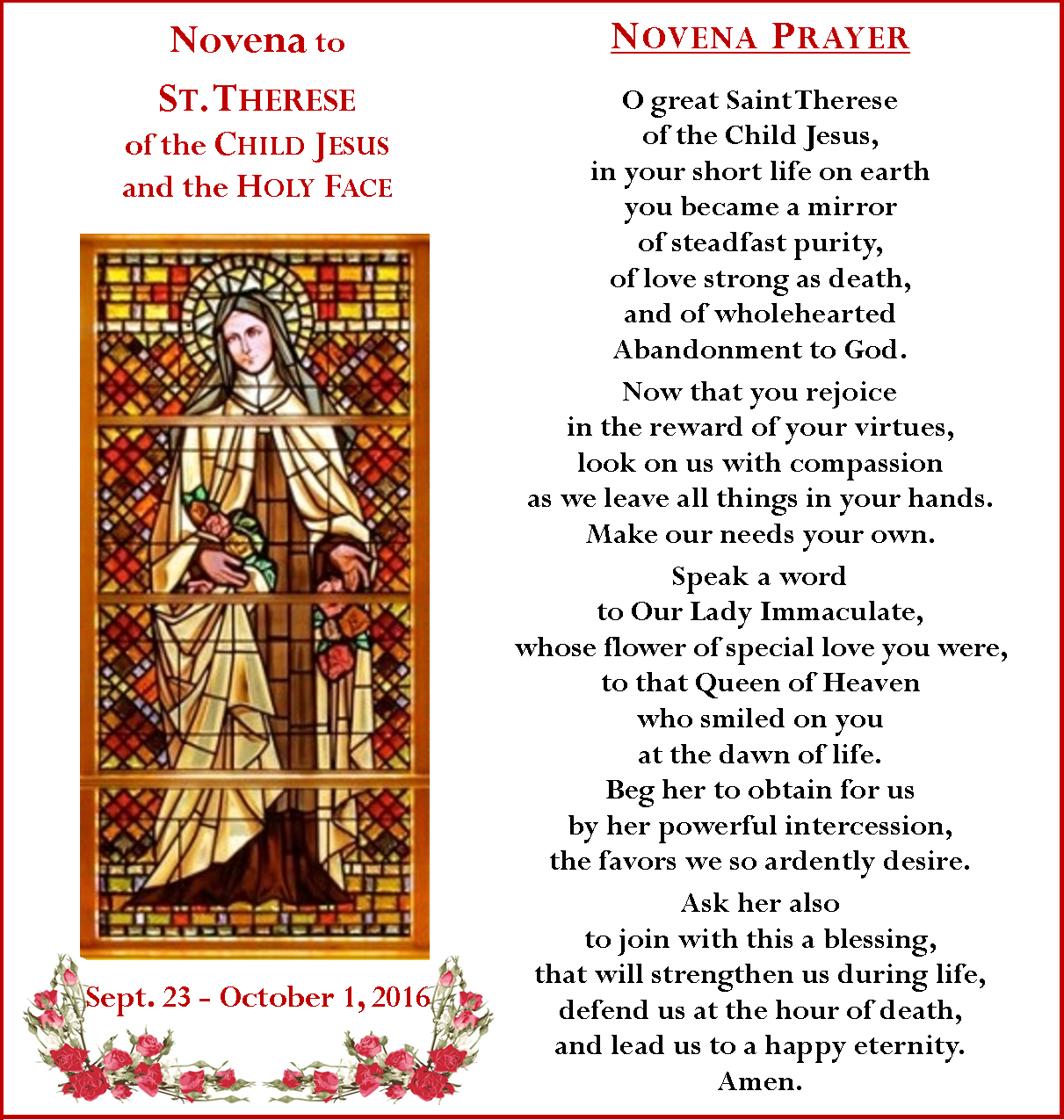 Novena to St. Therese September 23 thru October 1 Novena, Novena St Therese 9 Day Novena Saint therese, you were faithful to god even unto the moment of your death. May my life bring peace and love to the world through faithful. Pray for me that i may be faithful to our loving god. Bring before god my special intention… pray for me that i may have something of your confidence. In the loving promises of. St Therese 9 Day Novena.