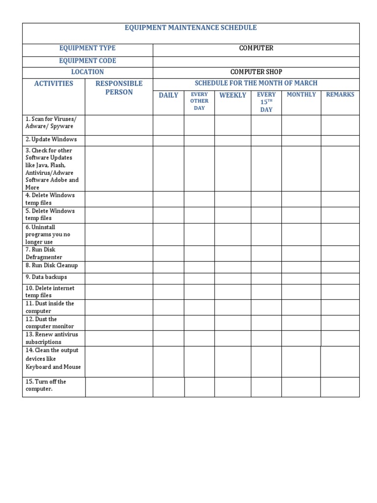Equipment Maintenance Schedule Equipment Type Equipment Code Location Schedule For The Month of