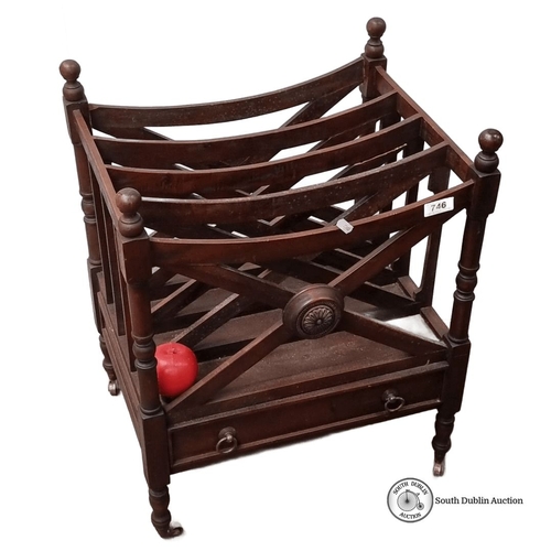 Victorian mahogany Canterbury with turned supports and lower drawer. Approximately 55 cm high, 45 cm