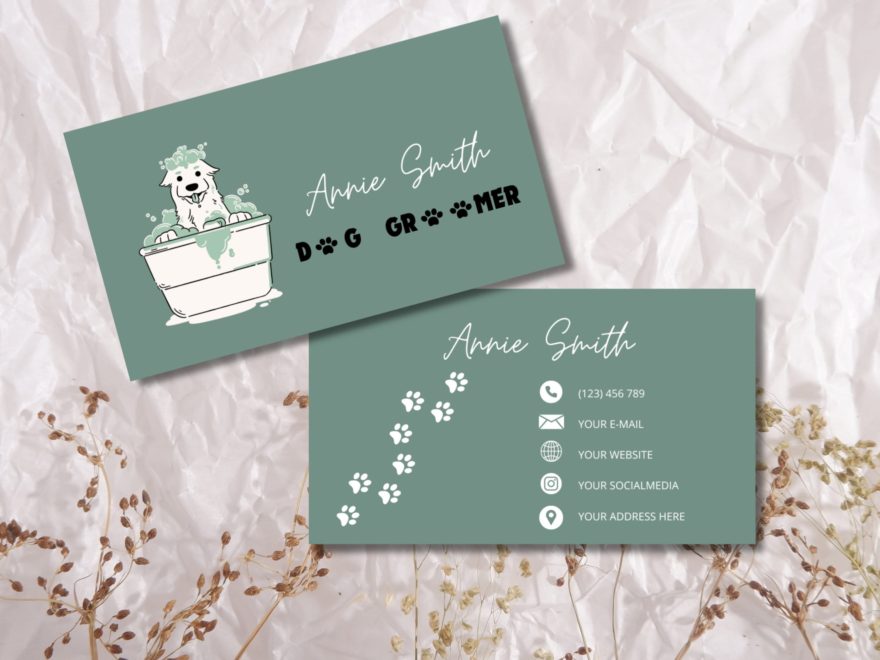 Dog Grooming Business Cards Dog Groomer Business Cards Check out our custom dog groomer business cards selection for the very best in unique or custom, handmade pieces from our templates. Find professionally designed animal grooming standard business cards templates & designs created by vistaprint. Choose from our dog grooming business card templates & customize them now. Make a pawsome first impression with templates that are free to edit. Dog Groomer Business Cards.