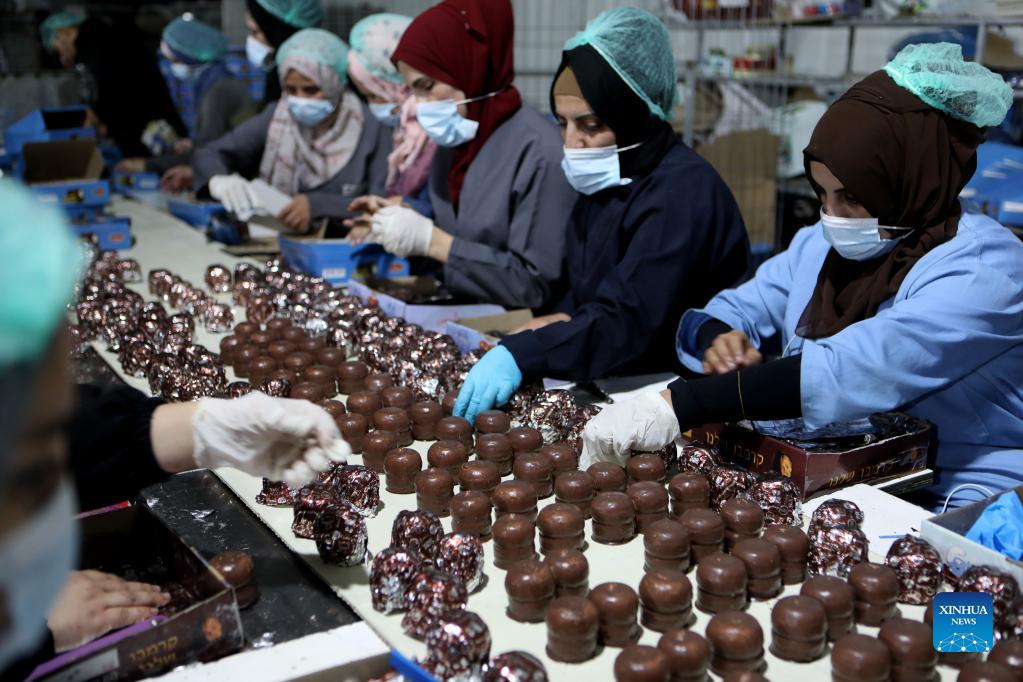 Palestinian workers make chocolate Ras elAbd at sweet factory in