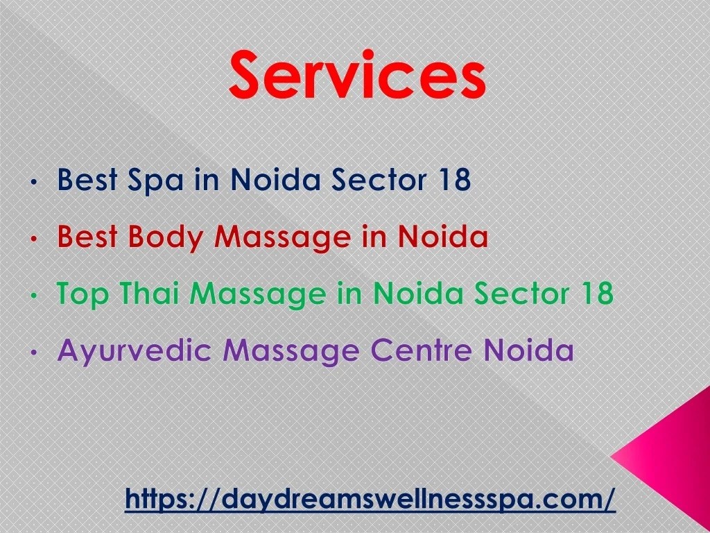 PPT Best Spa in Noida Sector 18 Day Dreams Wellness Spa PowerPoint Top 10 Spa In Noida Handpicked top 3 massage therapy in noida, up. Experience ultimate relaxation at the top spas in noida. Leave your troubles, stress, and worries behind. It is a modern spa in the effortlessly accessible sector. We check reputation, reviews, location, satisfaction, trust, and price to find you the best. Relax and unwind in some of the finest spa days and wellness. Top 10 Spa In Noida.