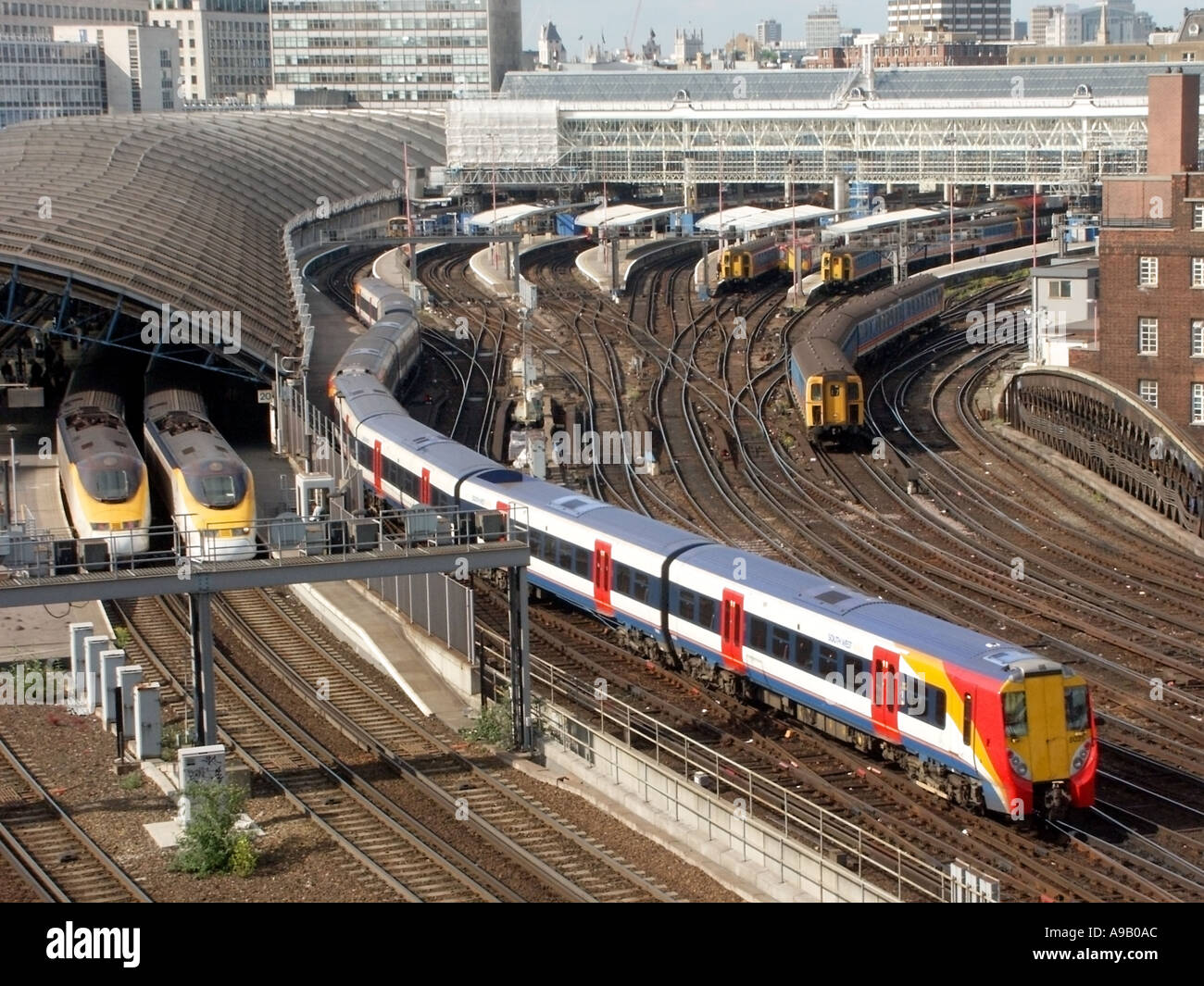 Waterloo train station platforms view from above of passenger trains