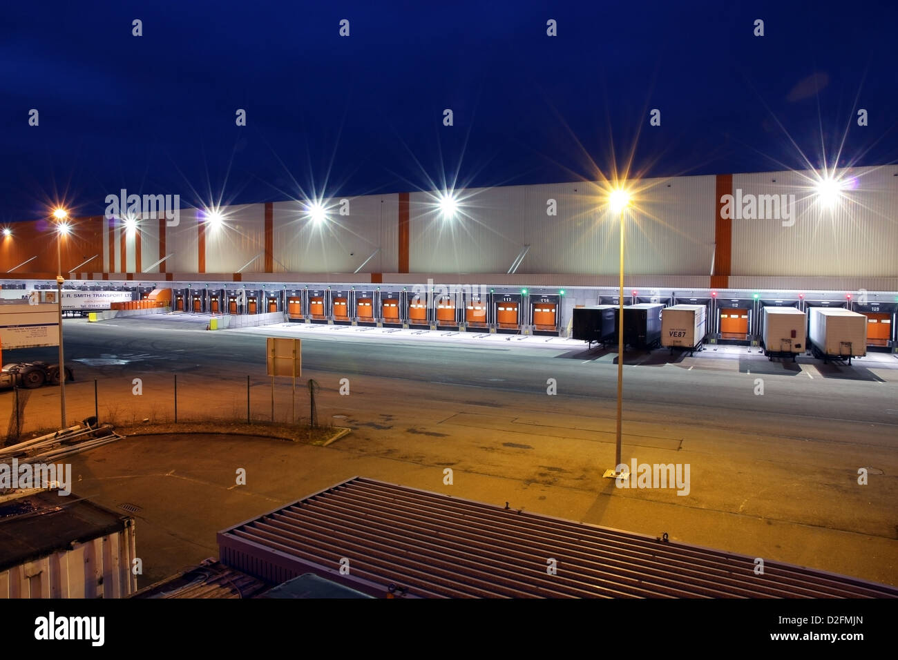gates for trucks on a warehouse at night with lights, empty Stock Photo