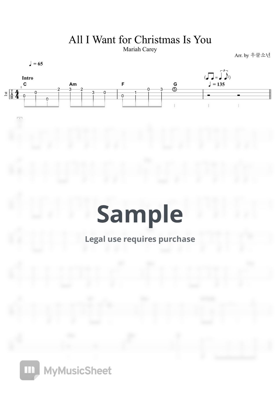 Mariah Carey All I Want for Christmas Is You (3 Part Ukulele Ensemble TAB) Sheets by 우쿨소년