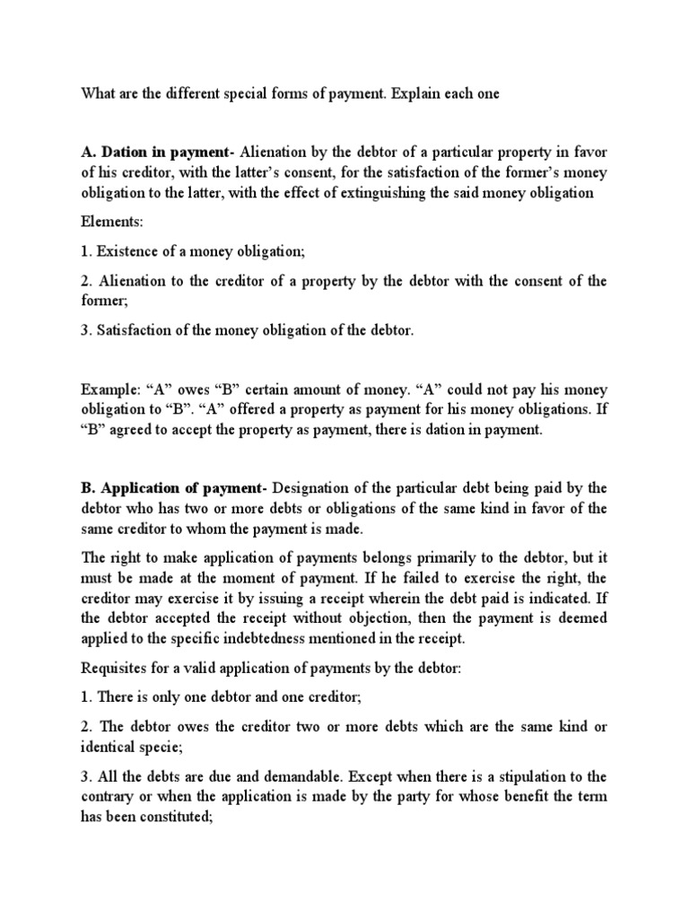 Civil Law Special Forms of Payment PDF Payments Debtor What Are The Special Form Of Payment (2) if the creditor ratifies o the. A detailed explanation with examples on special forms of payments. Dation in payment, application of payments, payment by cession, and tender of payment with. Dation in payment or dacion en pago is a special form of payment whereby another. Dation in payment and cession distinguished. Why is it called special forms of payment?. What Are The Special Form Of Payment.