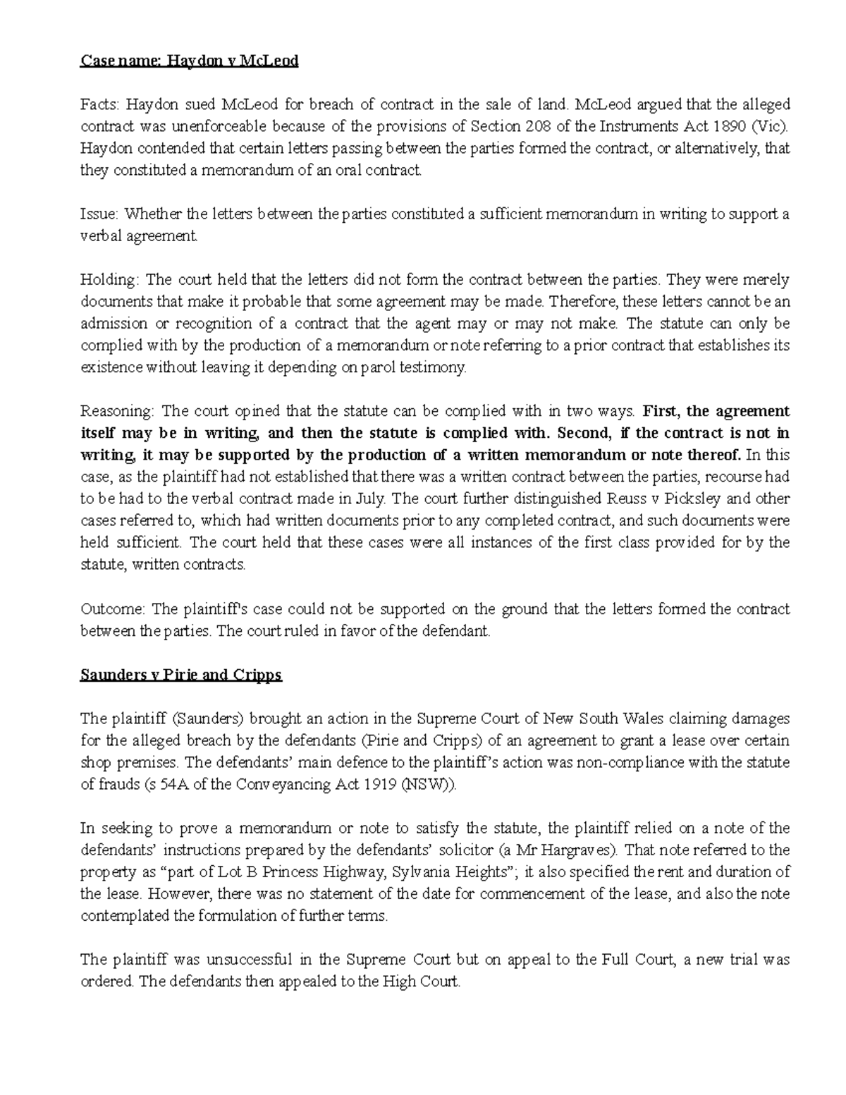 Case briefs about Statute of Frauds Case name Haydon v McLeod Facts