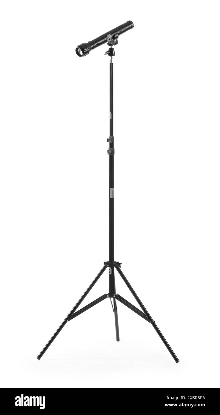 Tripod with spotlight isolated on white. Photo studio equipment Stock