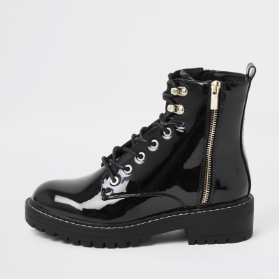 Black patent flat lace up chunky ankle boots River Island