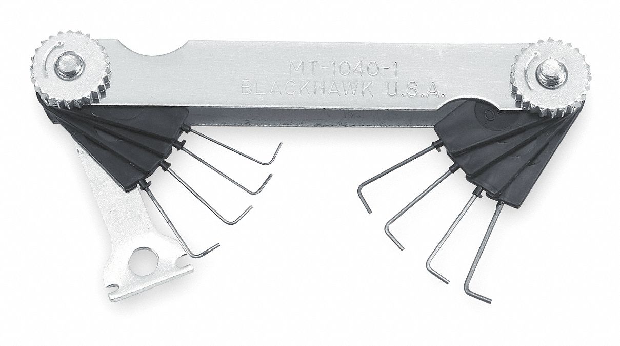 BLACKHAWK BY PROTO, Inch/Metric, 6 Feeler Blades, Ignition Wire Feeler Wire Feeler Gauges A wire feeler gauge can be called a gaping tool, and it is usually used for gap measurement of spark plugs. I bought these as a backup set. Sets include blade holder, electrode bender, and six bent wire gauges marked with decimal and. Number of feeler gauge blades Wire feeler gauges are not as versatile as brass and steel because. Wire Feeler Gauges.