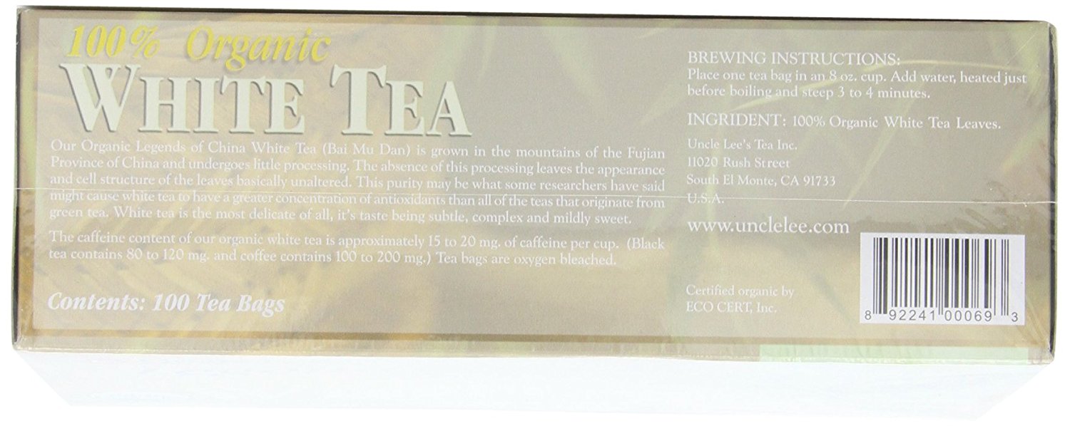 Uncle Lee's Tea Organic White Tea, Tea Bags, 100Count Boxes (Pack of 4