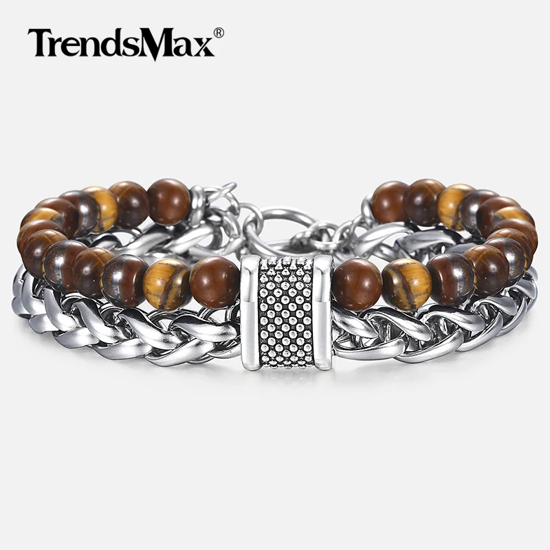 Tiger Eye Stone Men's Beaded Bracelet Stainless Steel Wheat Chain Bracelet Male Wristband