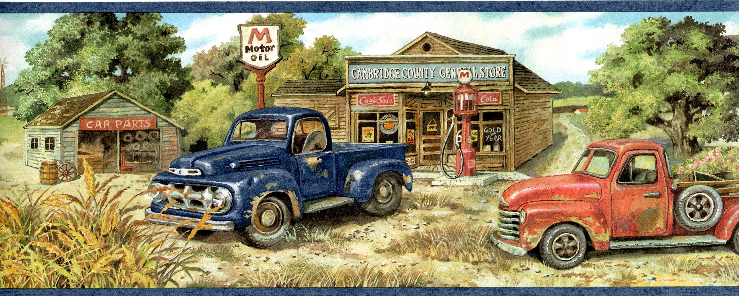 Country Blue & Red Antique Pick up Trucks Wallpaper Border Etsy