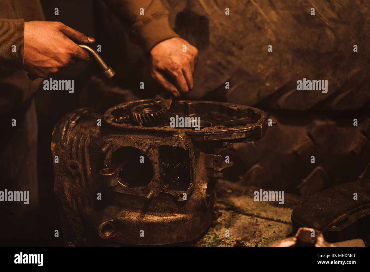 Motorcycle engine disassembly. Man removes rusty detail. Removal of Remove Motorcycle Engine in order to successfully remove the motorcycle engine, you’ll need to follow a systematic approach that ensures. They're the heaviest single component on your bike and removing them is the most daunting task. usually, it’s the high tension (ht) coil, starter relay (for self starter models). What to do next will depend on the type of motorcycle engine. Remove Motorcycle Engine.