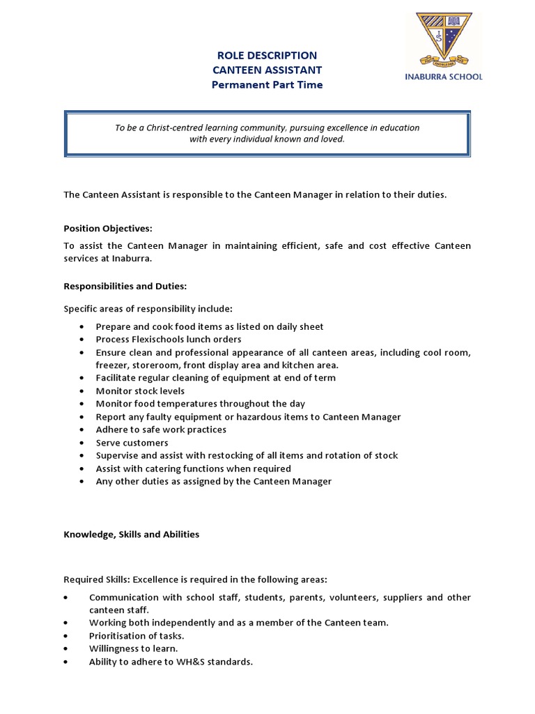 Canteen Assistant Job Description Appln Cafeteria Business