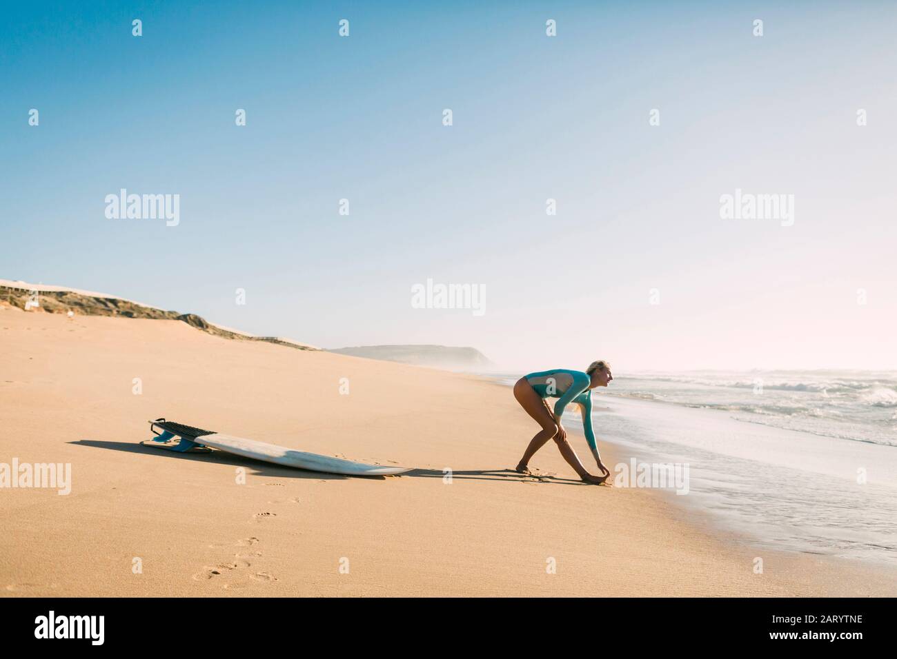 Woman wearing wetsuit stretching on beach Stock Photo Alamy