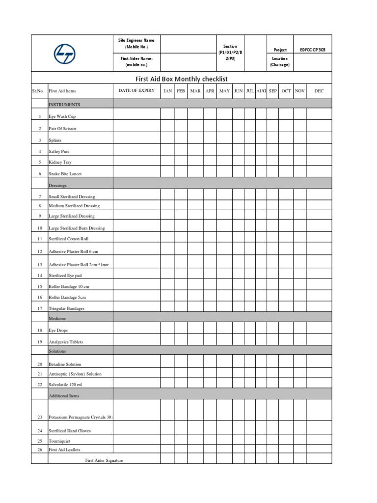First Aid Box Monthly Checklist PDF