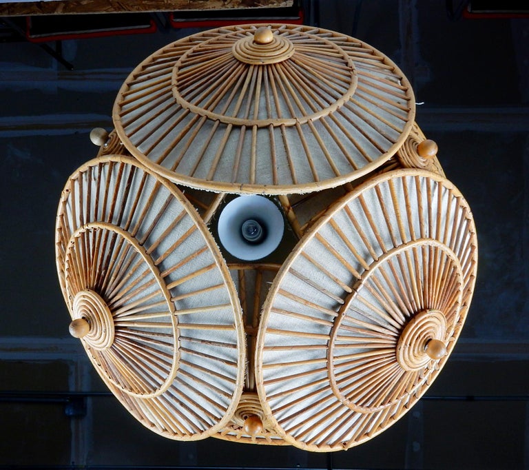 1950s Bohemian Rattan Wicker Parasol Cluster Chandelier For Sale at