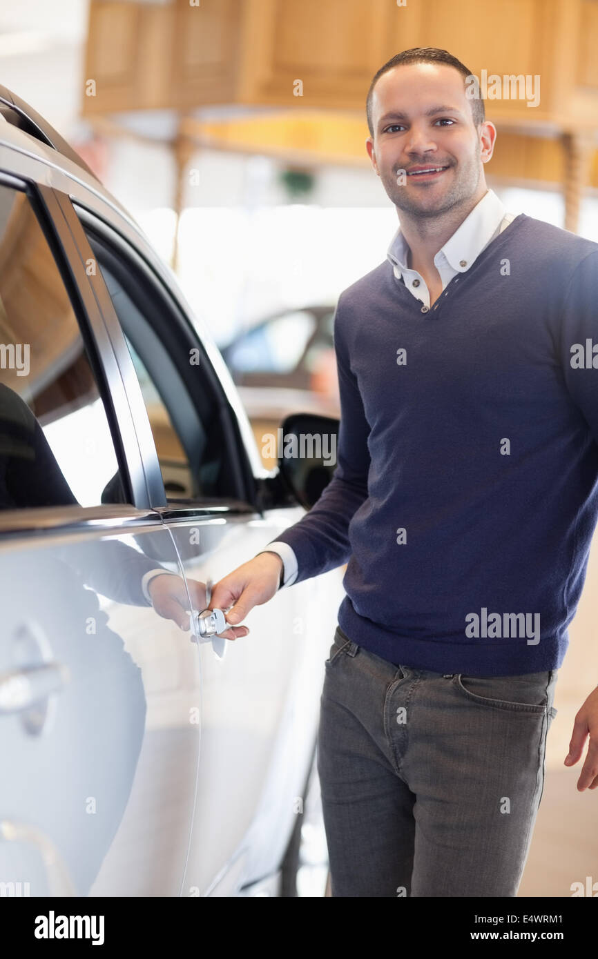 Man holding a car handle while smiling Stock Photo Alamy