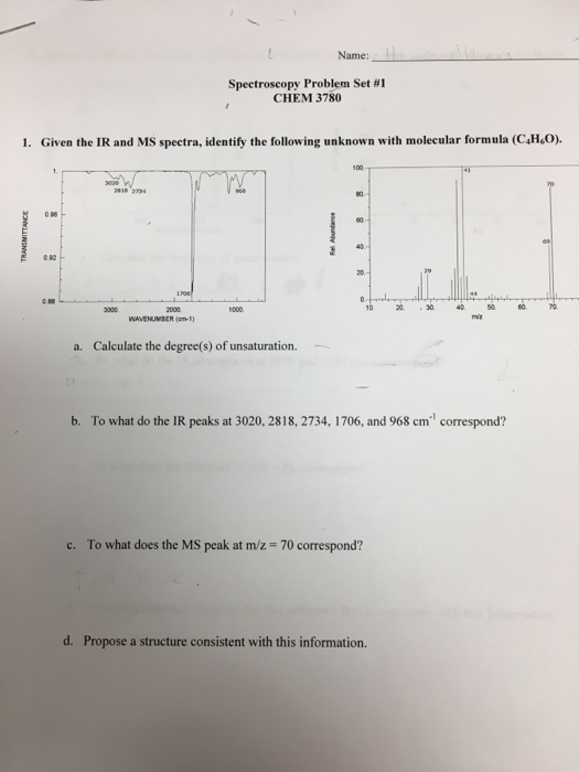 Solved Chem 3112 Combined Spectroscopy Problems Worksheet 6 Spectroscopy Problems And Solutions Pdf Combined spectroscopy problems 1.(15) identify the compound (draw the structure) that gives rise to the ir, mass and 1h nmr spectra. A deuterium discharge lamp and a tungsten. Chcl 3 has c 3v symmetry and therefore is a symmetric top. Ccl 4 is tetrahedral and therefore is a spherical top. Jim’s starting material has a monoisotopic mass of 344 (using. Spectroscopy Problems And Solutions Pdf.
