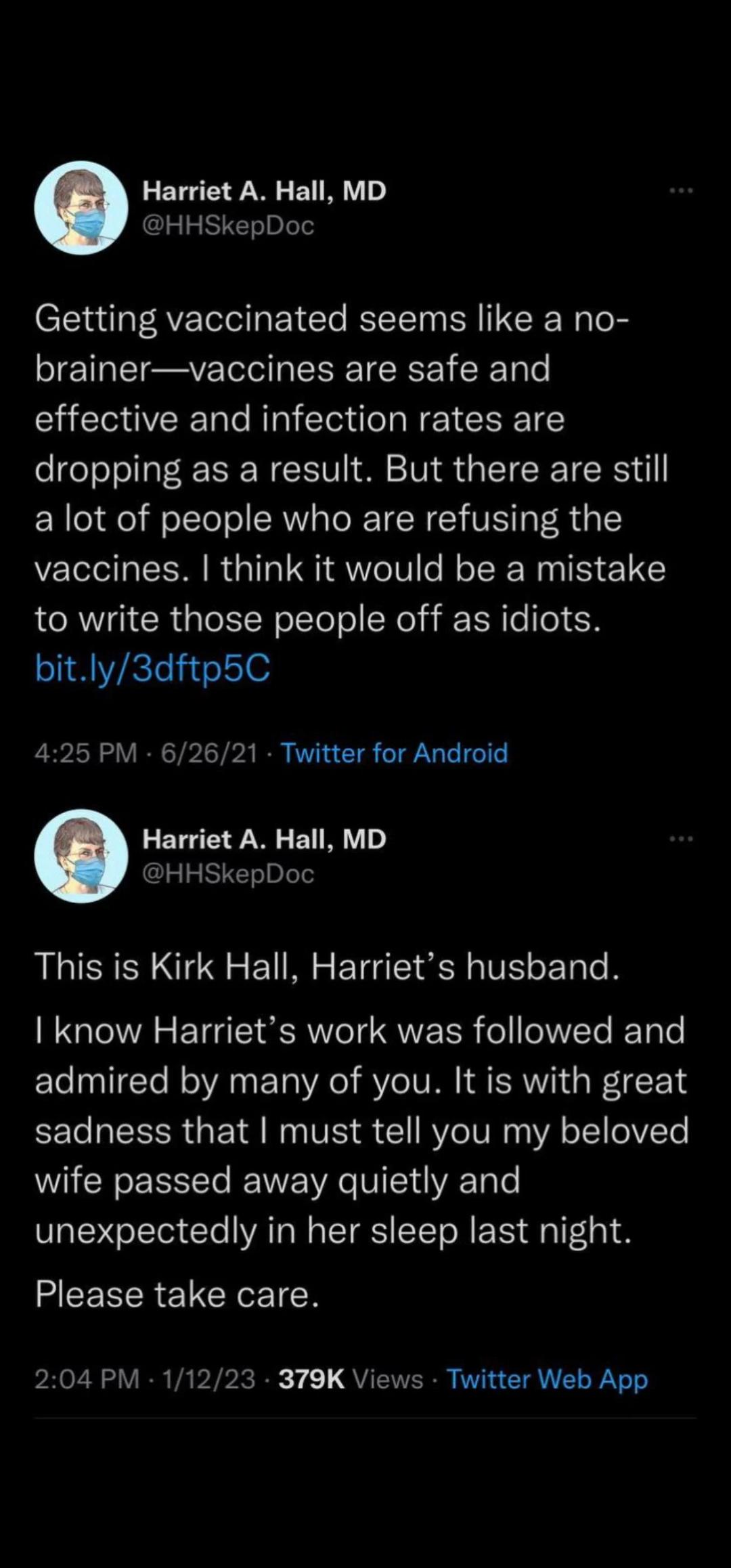 R.I.P. SkepDoc RESPECTFUL INSOLENCE Dr Harriet Hall Harriet hall, unexpectedly passed away on the evening of january 11. It is with profound sadness that i report to you that my good friend, dr. Hall, une visionnaire et une. The classic harriet quote — “always ask who disagrees and why” — is one of the most influential nuggets of information in my whole life. This is a tremendous. Dr Harriet Hall.
