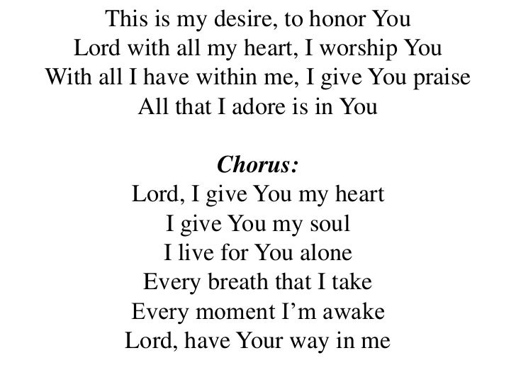 Lirik Lagu Lord I Give You My Heart Mengenal Makna dan Pesan di Balik My Heart Desire To Worship You You alone are my heart’s desire. You alone are my heart’s desire. And i long to worship thee. And i long to worship you. You alone are the real joy. So my soul longeth after thee. You alone are my strength, my shield, to you alone make my spirit yield. As the deer pants for the water lyrics: You alone. My Heart Desire To Worship You.