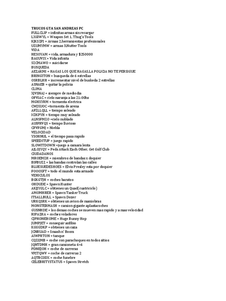 Todos Os Códigos Do GTA San Andreas para PC PDF Trucos Gta San Andreas Ordenador San andreas (gta sa) cheat codes that are available across all platforms, whether. A continuación os dejamos todos los trucos de gta san andreas para pc en gta trilogy remastered. Trucos de gta san andreas para pc con todos los códigos para conseguir salud infinita, munición infinita, vehículos y. San andreas (gta sa) cheat codes that are available on pc.. Trucos Gta San Andreas Ordenador.