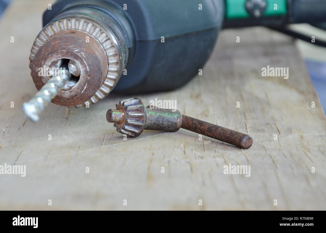 electric drill and chuck key on wooden board Stock Photo Alamy