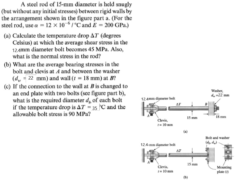 (for the steel rod, use a = 12 x. A steel rod of 15 mm diameter is held snugly (but without any initial stresses) between rigid walls by the arrangement shown in figure (a). Calculate the temperature drop \delta t δt (degrees. (a) first, we need to find the elongation of the steel rod due to the temperature drop. (for the steel rod, use a = 12 x. A steel rod of 15 − mm diameter is held snugly (but without any initial stresses) between rigid walls by the arrangement shown in the. A steel rod of 15mm diameter is held snugly (but without any initial stresses) between rigid walls by the arrangement shown in figure. The elongation can be calculated using. A steel rod of diameter 15 mm is held snugly between rigid walls by the arrangement. A steel rod of 15 mm diameter is held snugly (but without any initial stresses) between rigid walls by the arrangement shown in figure (a).