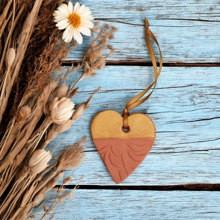 Embossed Heart Hanging Terracotta and Gold Diff... Folksy
