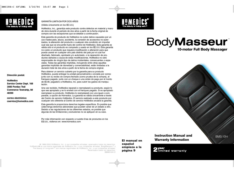 HOMEDICS BMS10H INSTRUCTION MANUAL AND WARRANTY INFORMATION Pdf