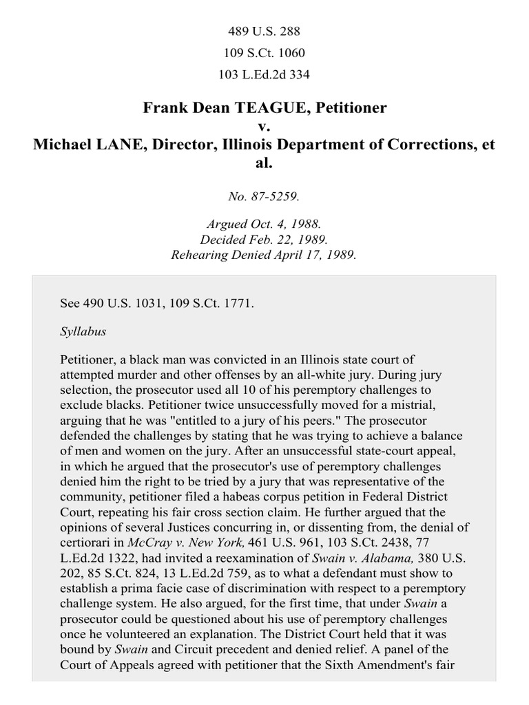 Teague v. Lane, 489 U.S. 288 (1989) PDF Batson V. Kentucky Teague V Lane Case Brief The petitioner, a black man, was convicted in an illinois state court for three counts of attempted murder, two counts of armed robbery, and one. Since 1989, the court has applied the teague doctrine to constitutional holdings in substantive criminal law and criminal procedure. Petitioner, a black man, was convicted in an illinois state court of. Teague V Lane Case Brief.