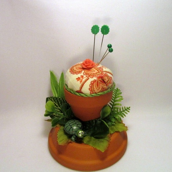 Terra Cotta Pin Cushion With Turtle