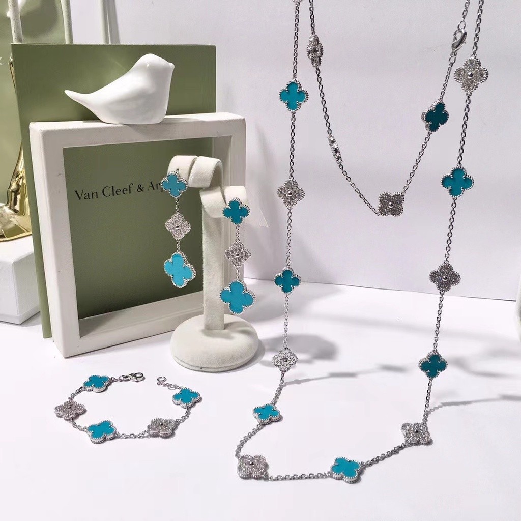 Van cổ điển Cleef bạch kim mạ cỏ ba lá bốn dây chuyền vòng cổ bông tai