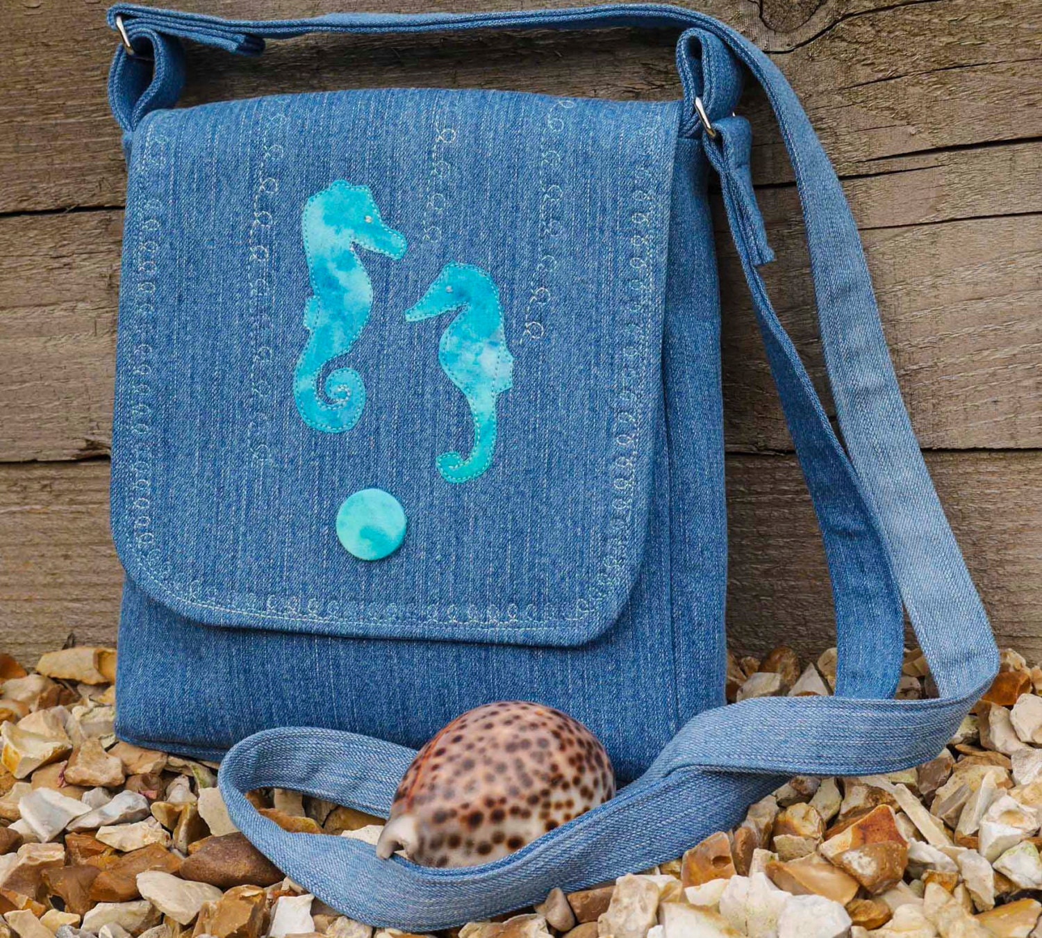 Blue denim crossbody bag made from upcycled fabric appliqued